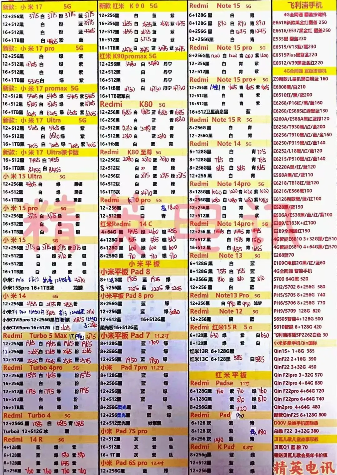 以下报价都是深圳华强北手机批发市场当天的最新批发价格(不含税),报价是我们的批发底价,零售拿货价格需加20~100元不等,京东包邮(量大价格可谈)