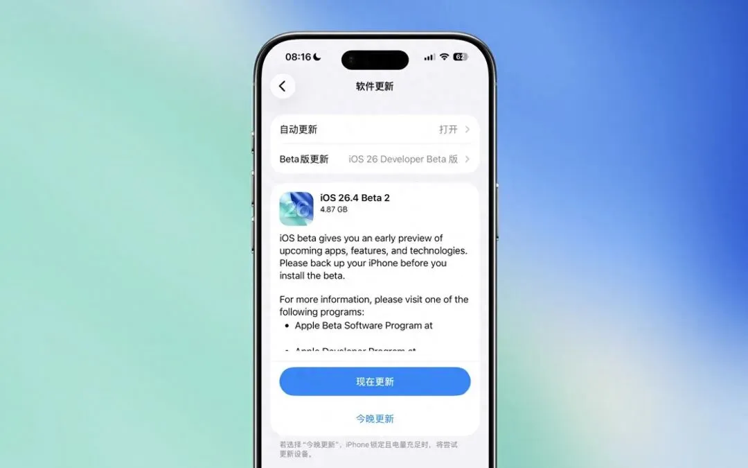 小编建议,如果已经更新到了 iOS 26.4 Beta 1,那么可以继续更新到 Beta 2。如果你还没有更新 iOS 26.4 Beta 的话,那么就没有必要更新。