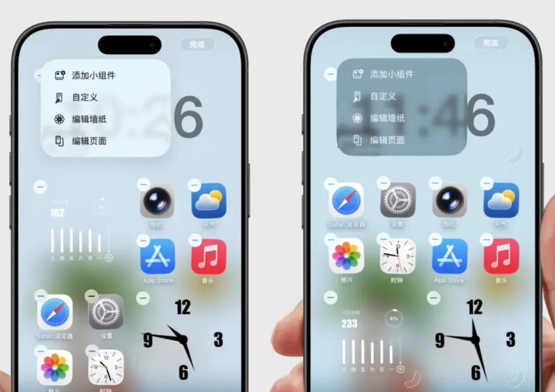主屏幕编辑页面菜单里的液态玻璃效果变得更透明了,整个看起来更协调统一;另外控制中心控键长按之后弹出的菜单,里面的液态玻璃效果透明度也提高了。
