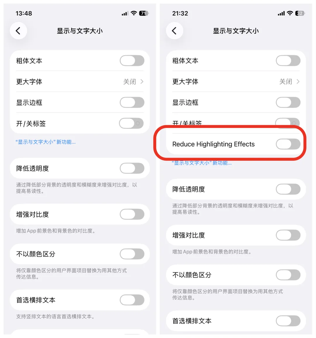 这次 iOS 26.4 beta 2 增加了一个新功能。在设置-辅助功能-显示与文字大小中,新增了“减少高亮效果”开关。