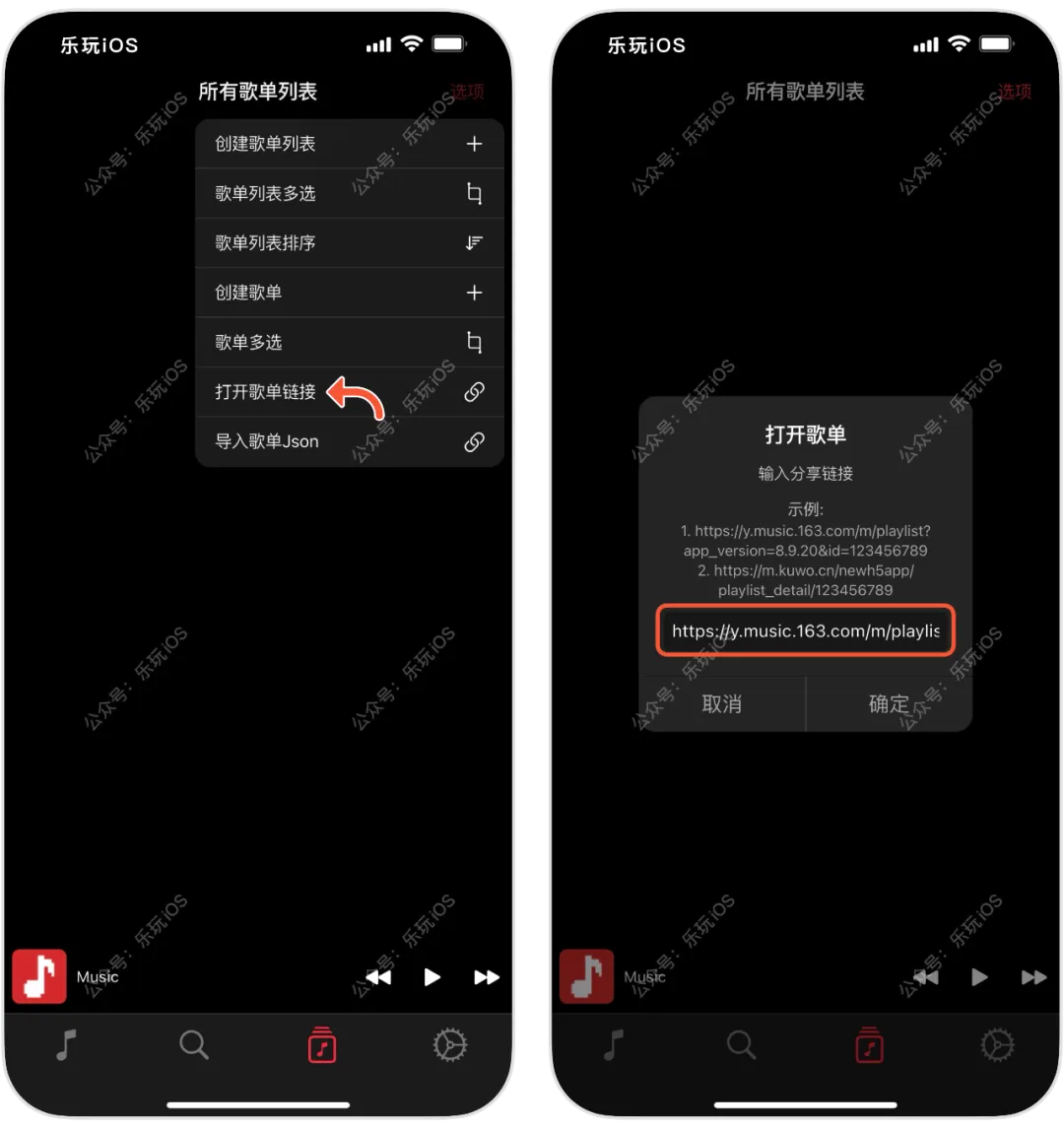 · 点击打开歌单链接,粘贴链接,点击确定即可