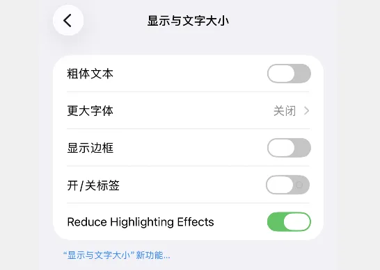 在 iOS 26.4 beta 2 内测中,设置-辅助功能-显示与文字大小页面中,新增 Reduce Highlighting Effects 选项,这里的意思是减少高亮显示效果。