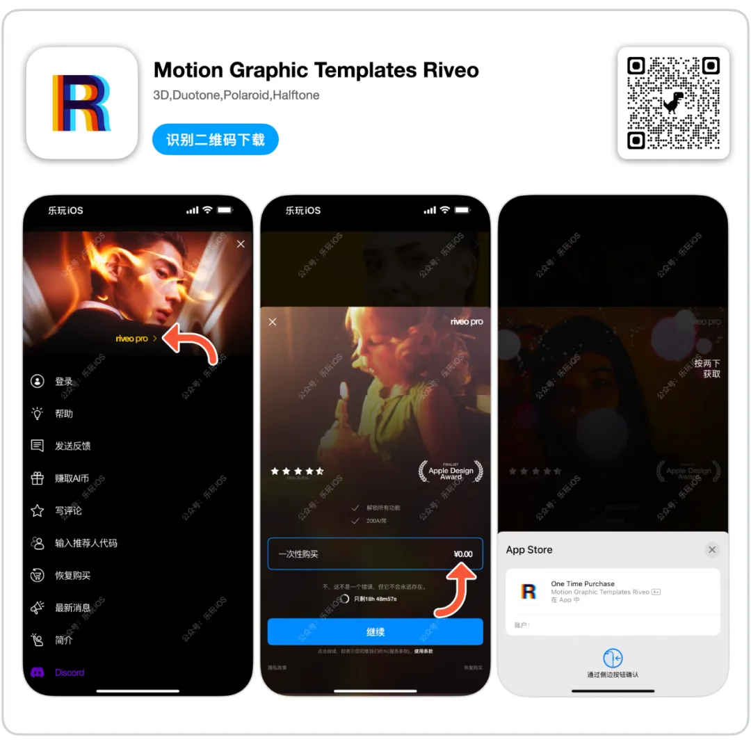 点击「riveo pro」,点击「一次性购买¥0.00」