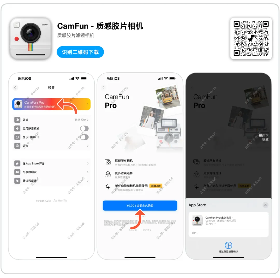 点击「CamFun Pro」,点击「全部永久购买¥0.00」