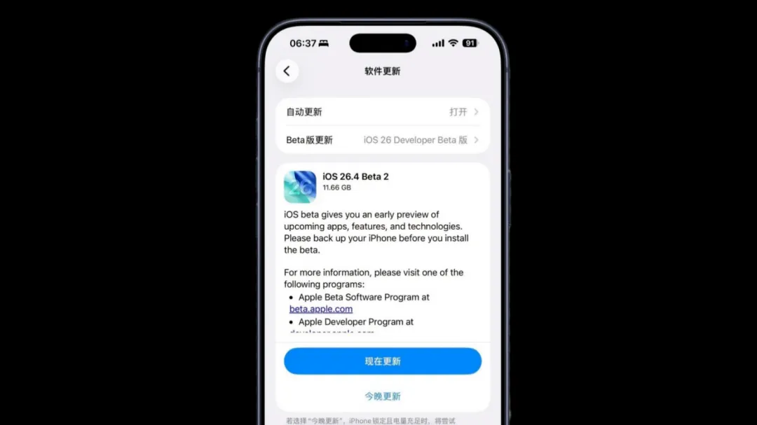 刚给手机插电,手一滑点进软件更新,iOS 26.4 Beta 2 弹出来,版本号 23E5218e,距离上个测试版也就一周,推送节奏突然快了,升完重启,屏幕一亮,眼睛先扫一圈,整合 Gemini 的 Siri没见,国行 AI也没见,心里那两件事先记住,回头再看别的东西。