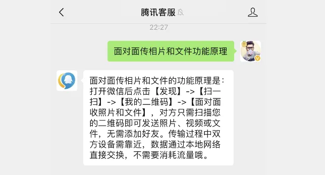 注意!此功能腾讯官方回应称,只需扫描您的二维码即可发送相片、视频或者文件,不用添加微信好友,传输过程双方设备靠近,数据通过本地网络直接交换,不需要消耗流量,使用全新的方法传输内容。