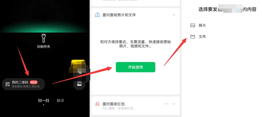 要求最新 8.0.69 及更新版本才有,不需要流量也不用添加好友,可以面对面发送文件、相片或者视频。