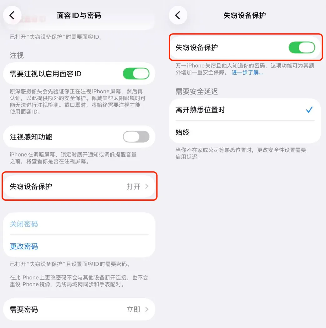 失窃设备保护功能目前默认是处于强制开启的状态。就算其他人知道你的锁屏密码,在陌生的环境下也无法关闭查找、抹掉数据或者更改Apple ID。除非你经常将手机借给他人使用,否则建议不要关闭。安全比方便更为重要。