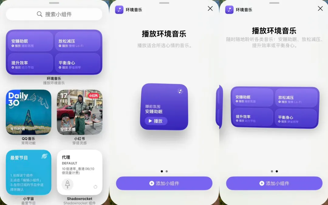 主屏之上多了两个环境音的小组件。它们的尺寸分别为2乘2以及2乘4。点击一下就能够放出雨声、森林声或者白噪音。不需要打开应用程序。这个既适合在工作的时候使用,也适合在冥想的时候使用,还适合在睡觉的时候使用。