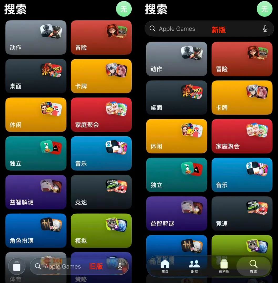 Game Center的搜索框位置发生了变化,从底部转移到了顶部,如此一来操作起来更为便捷顺手。在主屏上进行长按以进入编辑模式之后,菜单更换成了iOS 26的液态玻璃样式,呈现出半透明并且带有模糊的效果,看起来更加精致。