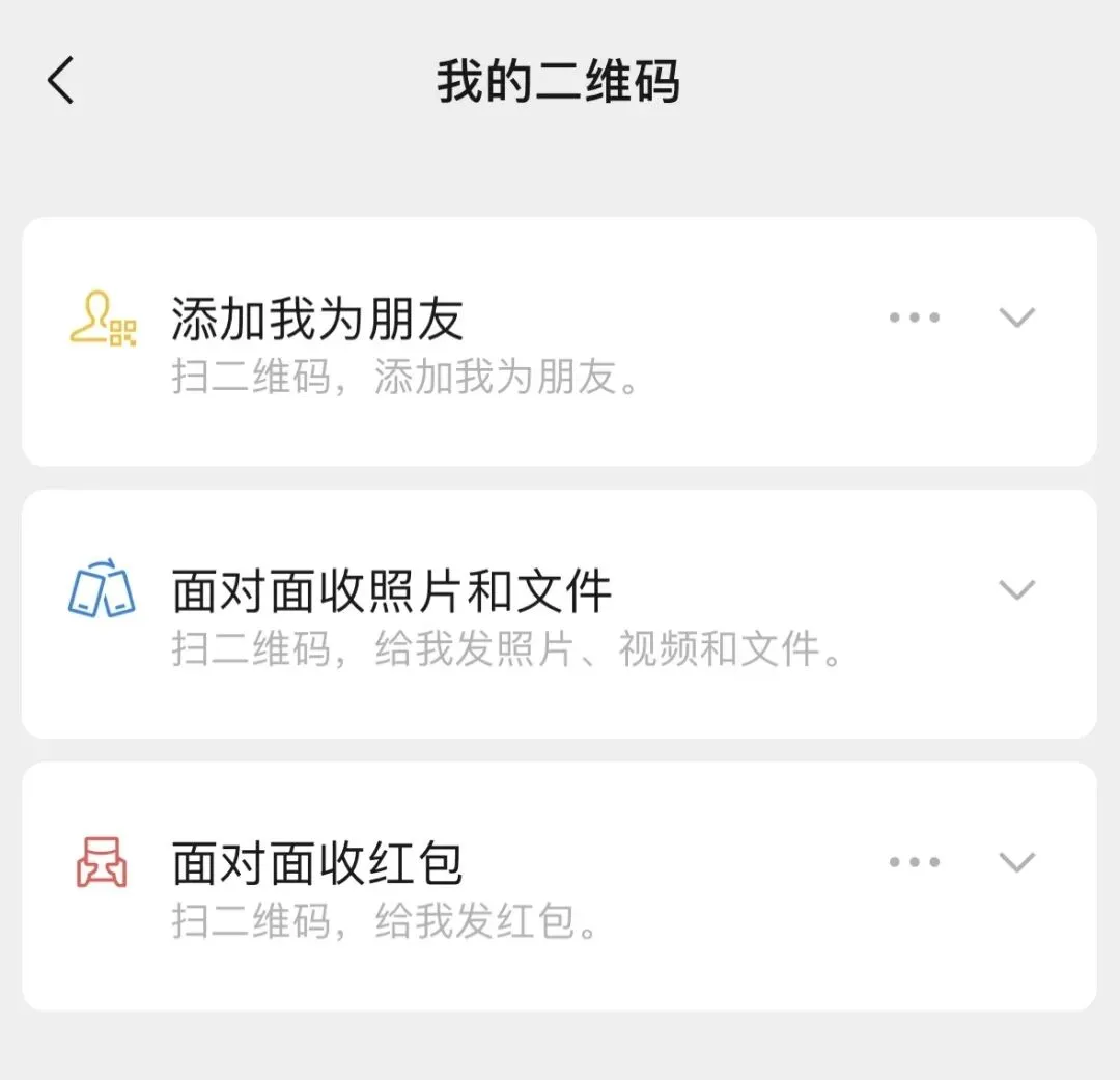 现在打开「扫一扫」-左下角「我的二维码」,你会看到「添加我为朋友」、「面对面收照片和文件」、「面对面收红包」。