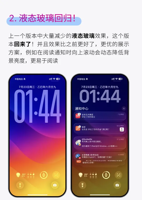 到 iOS 15 上新拟态有了更多层次,到 iOS 17 动态岛把这种玻璃效果跟功能场景绑在一起,这次 Beta 2 的渲染更柔更流动,像在向经典的玻璃美学点头又往前迈了一步,毛玻璃慢慢变成液态玻璃这种说法也有人认同,设计师爱这种极致的视觉,用户看动效顺眼,底层渲染的这点微调,敏感的人会察觉到。