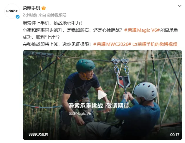 既然如此,影像能力应该也足够强大,亿级像素镜头肯定是少不了的,拍摄能力肯定会史无前例的强,官方还展示了Magic V6令人难以置信的坚韧程度,居然能在滑索上承受一个人的重量,防护能力肯定会再上一个台阶。