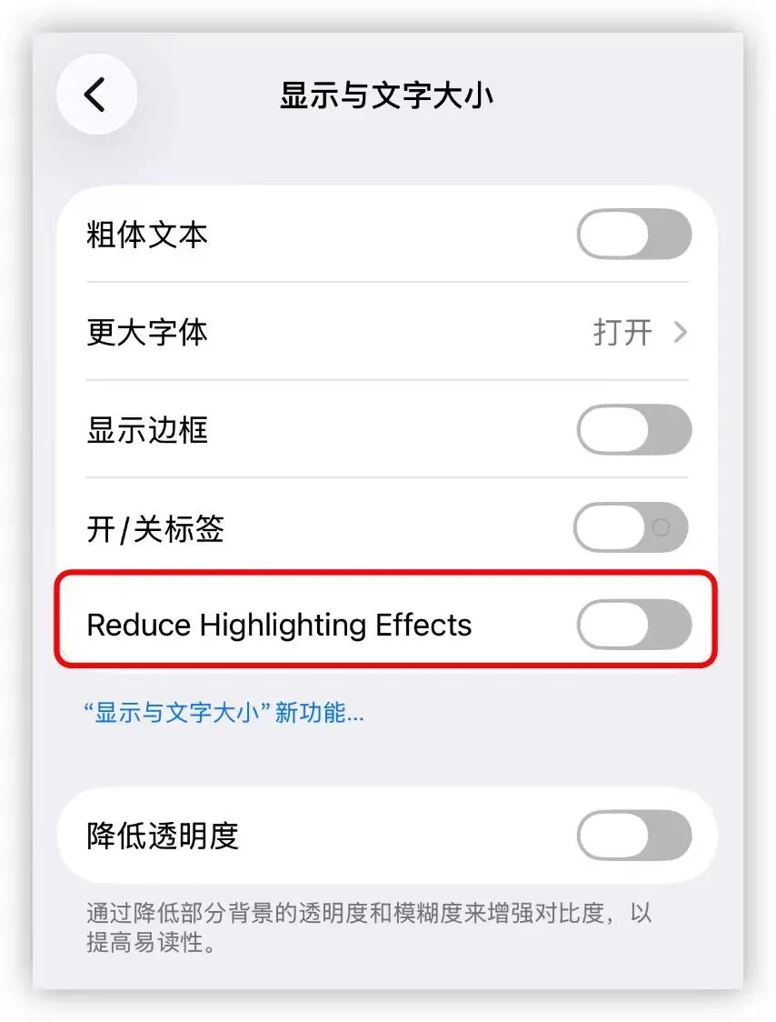 界面细节统一也动了几处,Games 的搜索栏从底部移到顶部,跟 App Store 一样,App Store 和 Apple Music 的账户中心里,Apple Account 的字样改成左对齐,Logo换成系统设置里那套彩虹苹果,视觉风格一致,辅助功能里加了一个减少高亮效果的选项,在设置—辅助功能—显示与文字大小,打开后按钮和滑块边缘的高亮会弱一些,长时间看屏幕眼睛压力小一点。