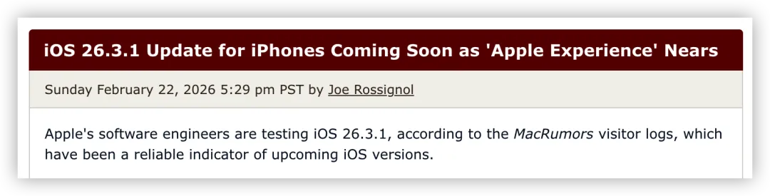 但外界普遍认为,iOS 26.3.1 正式版仍有望在本周到来。