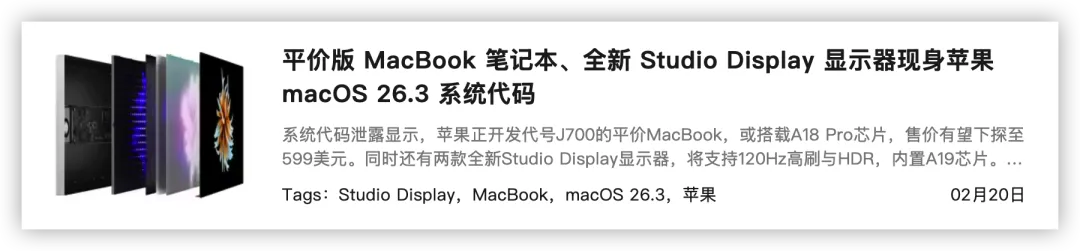 此外,从 macOS 26.3 系统内部代码中挖掘出的信息,也印证了这一点。三款新品的代号分别为 J700、J427 以及 J527。其中,J700 多半代指入门款 MacBook,它将成为首款搭载 A 系新品的 Mac 产品。而代码中的 J427 和 J527,则是新款 Studio DisPlay 的不同型号。相较现款,新款 Studio DisPlay 将支持 120Hz 高刷,并内置 A19 芯片。按照这一节奏来看,苹果应该会在近期发布 iOS 26.3.1 系统。戳这里,不迷路