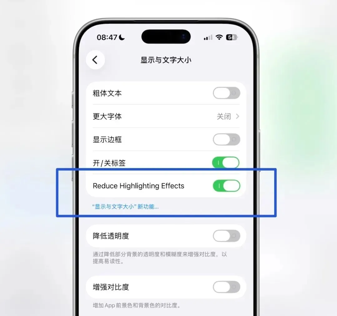 视觉舒适度优化也迎来新进展,系统在辅助功能的显示与文字大小板块,新增了降低高亮刺激的选项。该选项旨在弱化界面中过于刺眼的高光区域,让长时间看屏幕的用户视觉更放松。
