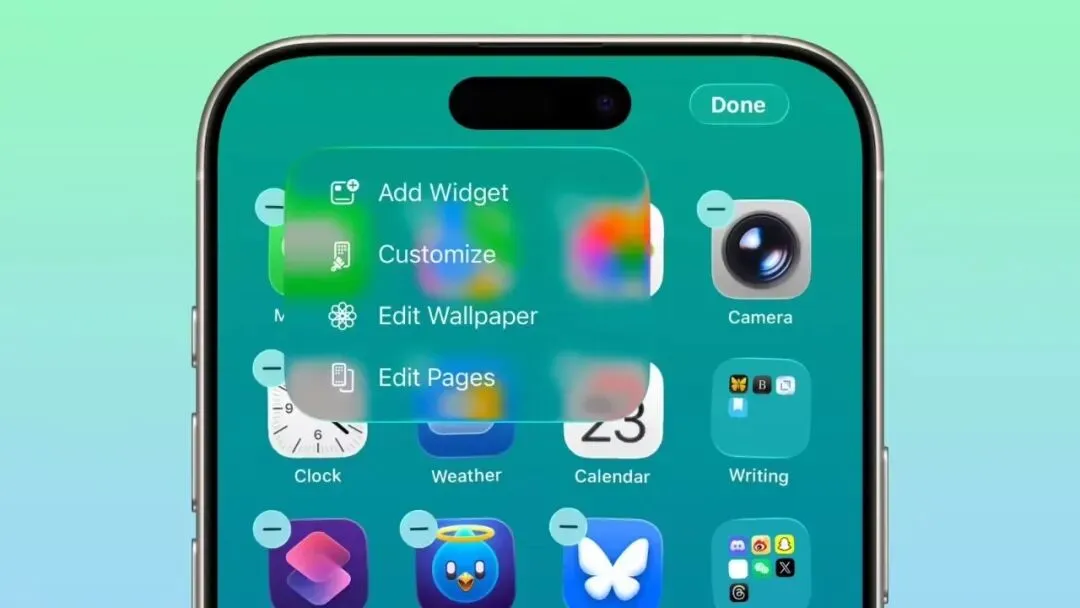 其次是桌面视觉升级,长按主屏幕呼出的“编辑”菜单,全面升级为液态玻璃效果,这种设计兼具玻璃的通透感和灵动性,和iOS整体视觉风格更契合。