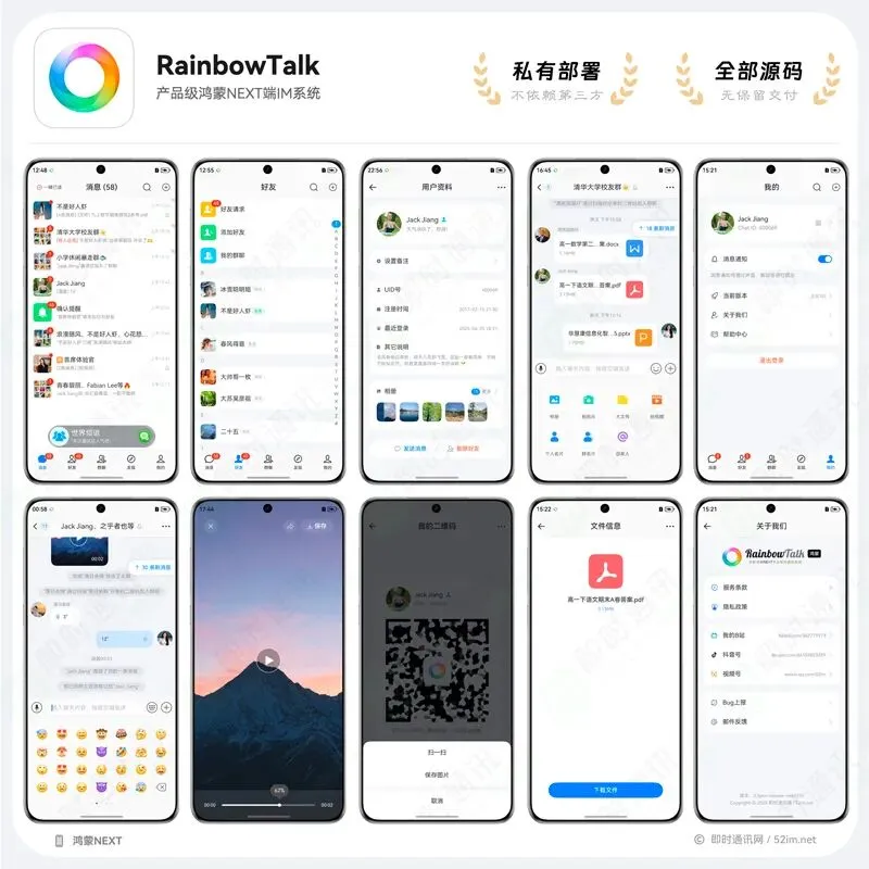 RainbowTalk 是一套基于 MobileIMSDK 开源通信框架的产品级纯血鸿蒙NEXT端IM系统。RainbowTalk与姊妹产品 RainbowChat技术同源 ,不同于市面上某些开源或售卖的demo级代码,RainbowChat已被成千上万真实的客户使用过,解决了大量的产品逻辑、代码逻辑、细节优化等问题。