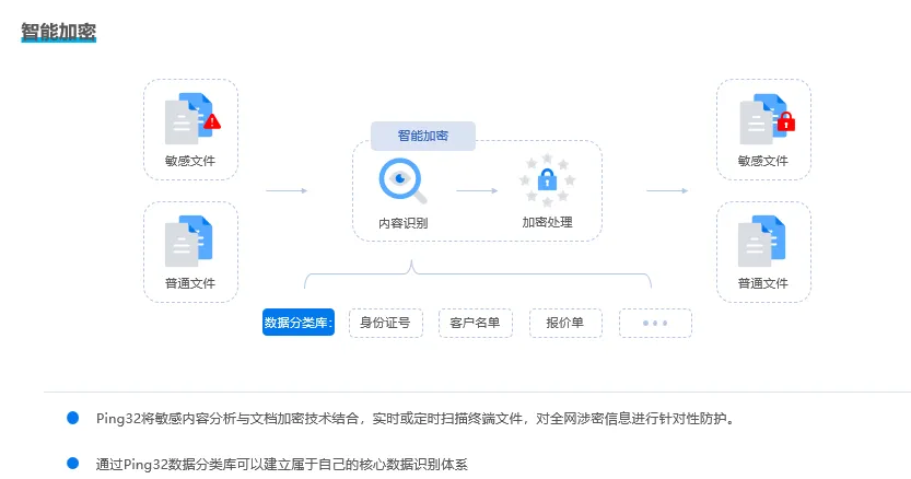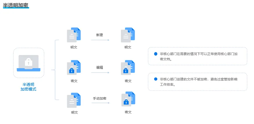 多模式加密:支持透明、半透明、智能三种加密模式,满足不同场景需求。半透明模式下,非核心部门可使用核心部门加密文档但自身文件不加密;智能加密结合敏感内容识别,自动对含身份证号、客户名单等敏感信息的文件加密,避免过度管控影响效率。