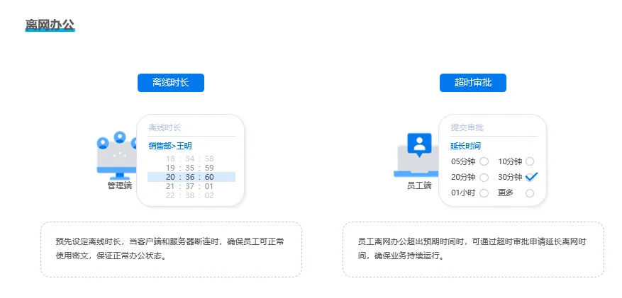 全场景适配与审批:支持离网办公场景,可预设离线时长,超出后可通过审批延长。文件外发、解密、邮件传输等操作需经审批,支持 PC 和移动端实时处理。还能与 OA、ERP 等业务系统集成,实现文件上传自动解密、下载自动加密,适配各类办公需求。