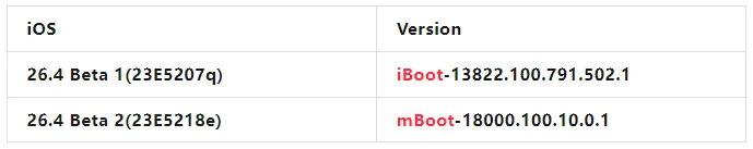 2月24日,苹果推送了iOS 26.4 Beta 2测试版,版本号23E5218e。这次更新苹果把iOS用了近20年的底层启动器iBoot改名mBoot。