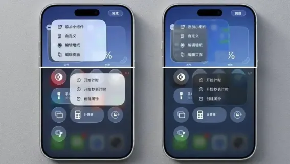 液态玻璃改进:长按桌面进入编辑模式,菜单的透明度更透明了。深色模式下,控制中心的弹出菜单又变回了熟悉的黑色。