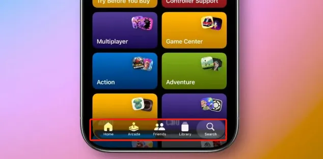 游戏 App :搜索栏从底部移到了顶部,外观和App Store 的底部标签类似。