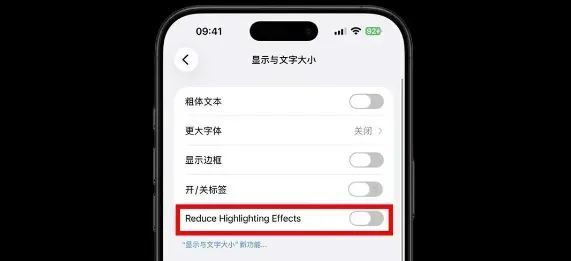 减少高亮效果:打开【设置】→【辅助功能】→【显示与文字大小】就看到新增了【Reduce Highlighting Effects】开关,翻译后是减少高亮效果。