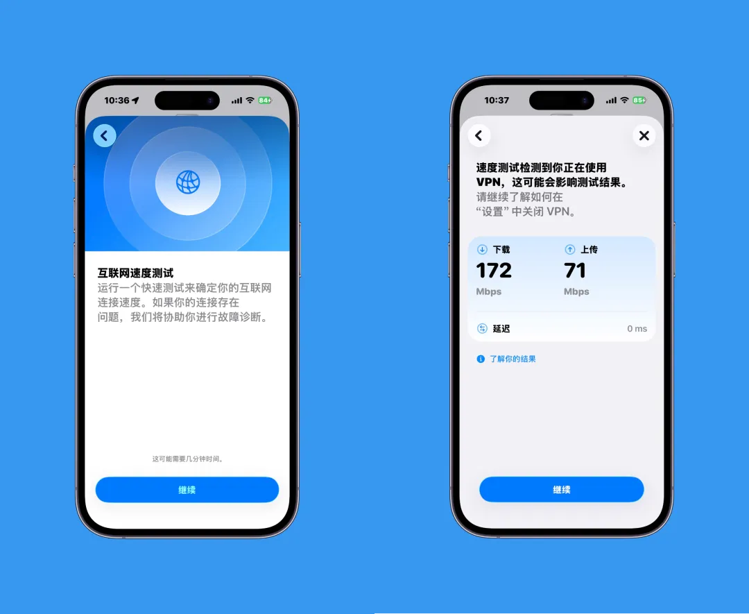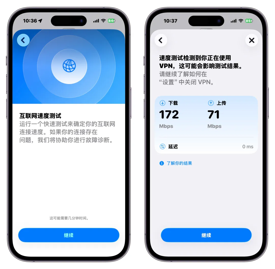 苹果最近在最新版「Apple 支持」App 里加入了一个挺实用的小功能:可以直接测网速了。