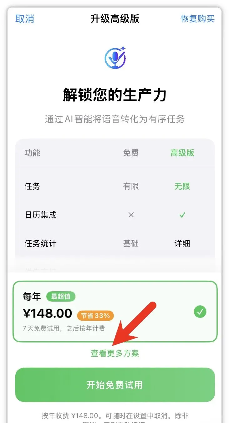 ● 高级版:无限任务、日历集成、详细任务统计、优先级视图等,更适合重度使用者。