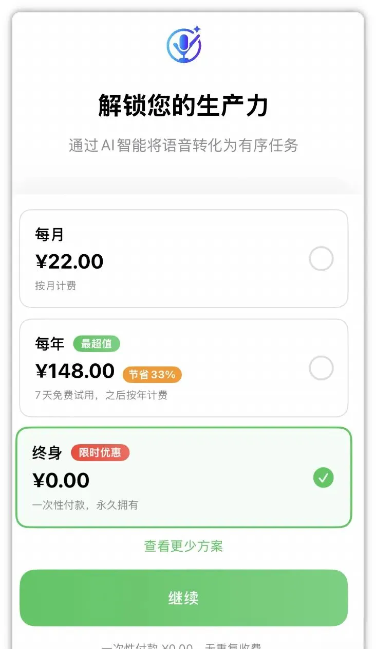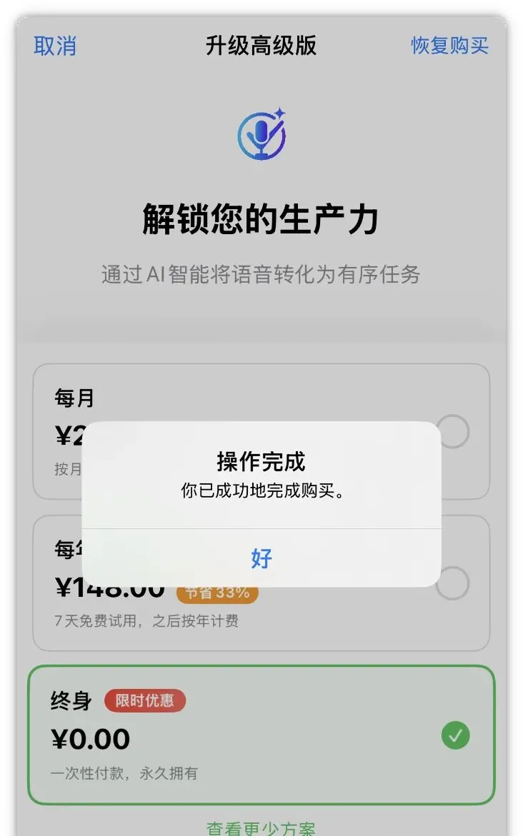 ● 目前在App Store限时免费,原价终身版可能需要付费(如截图显示原价¥0.00可能是促销或误标,但确实有“限时优惠”标识)。