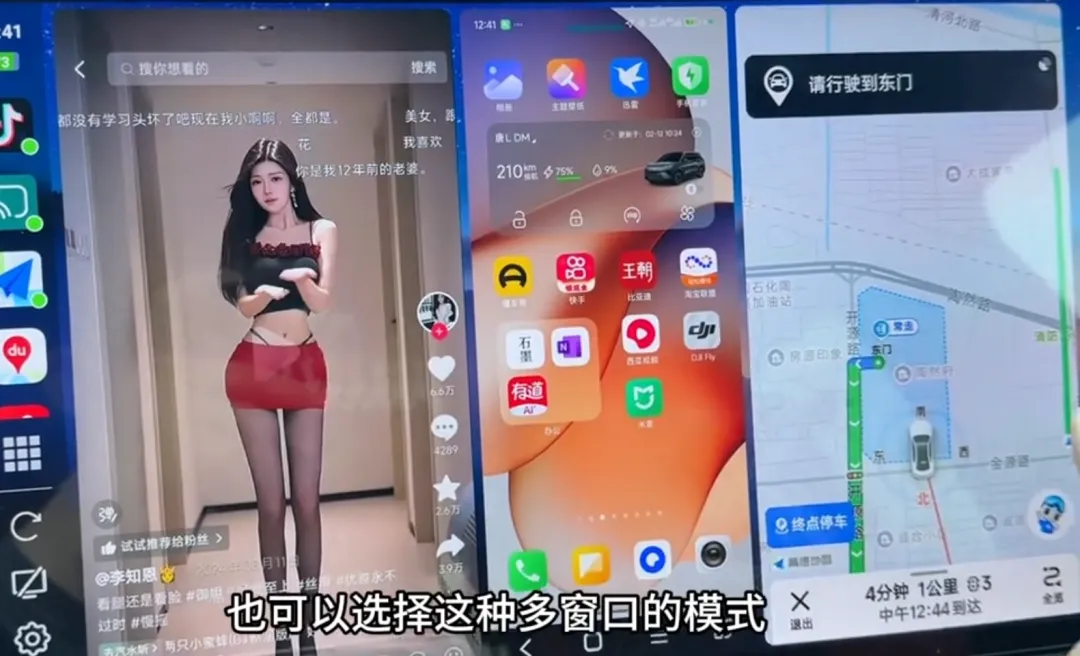 如果你不喜欢刚才那种大屏模式的话,也可以选择多窗口的模式,比如手机也可以直接操作导航,可以刷短视频,也可以通过方向盘上下键操作。