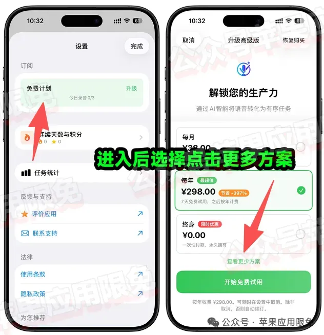 一款AI语音待办事项(语音功能需要特殊网络)。目前可以免费获取终身会员,打开软件从设置进入内购,点击更多方案后终身显示0即可免费获取,首次打开不显示就重启,设备需装有 iOS 16.6或更高版本。