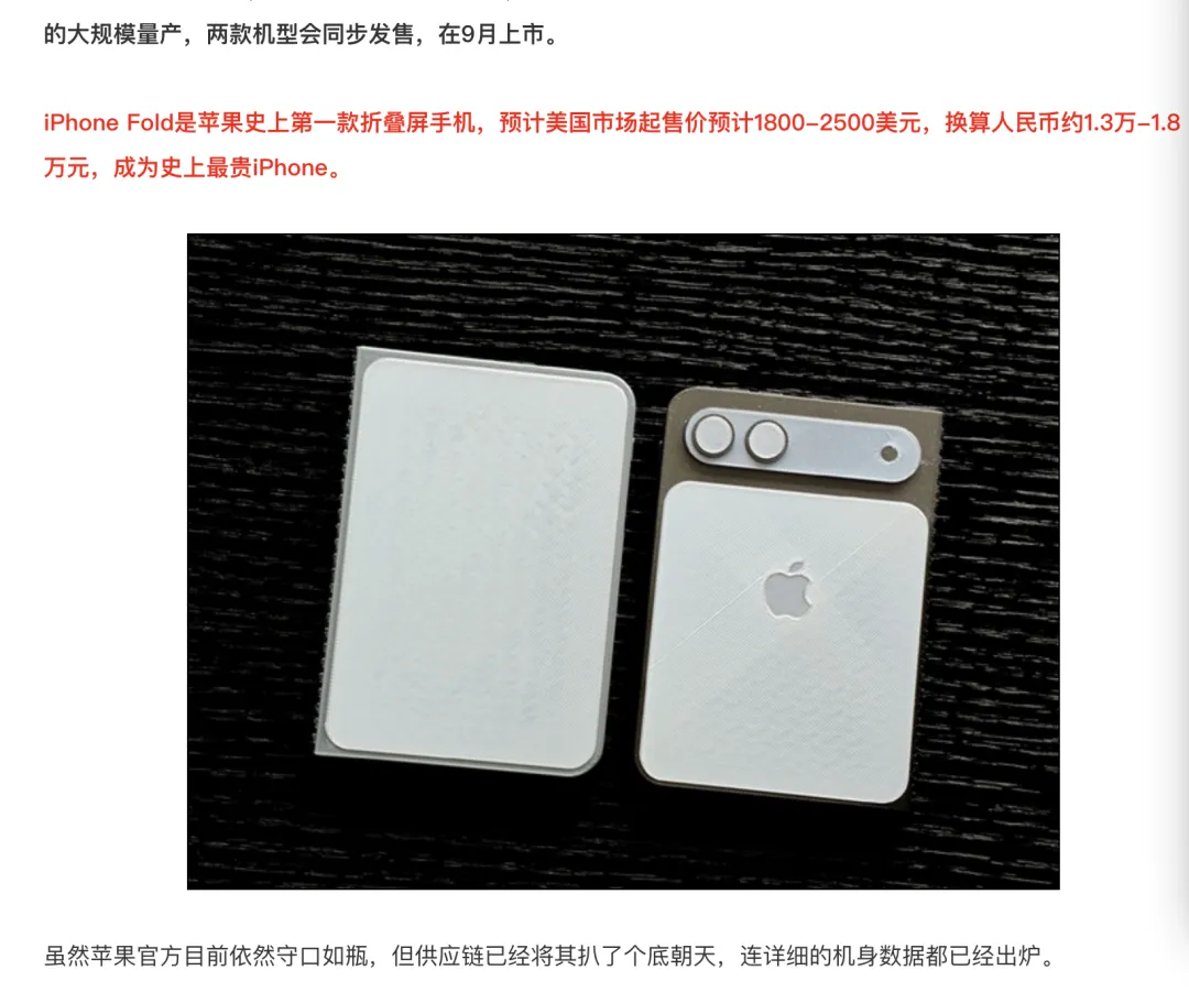 硬件配置上,iPhone Fold内屏尺寸约为7.8英寸,采用三星独家供应的LTPO OLED面板,支持120Hz动态刷新率,屏幕比例约为4:3,外屏约为5.3英寸,后置4800万双摄,首发A20 Pro芯片,配备12GB内存,电池容量约为5500mAh。