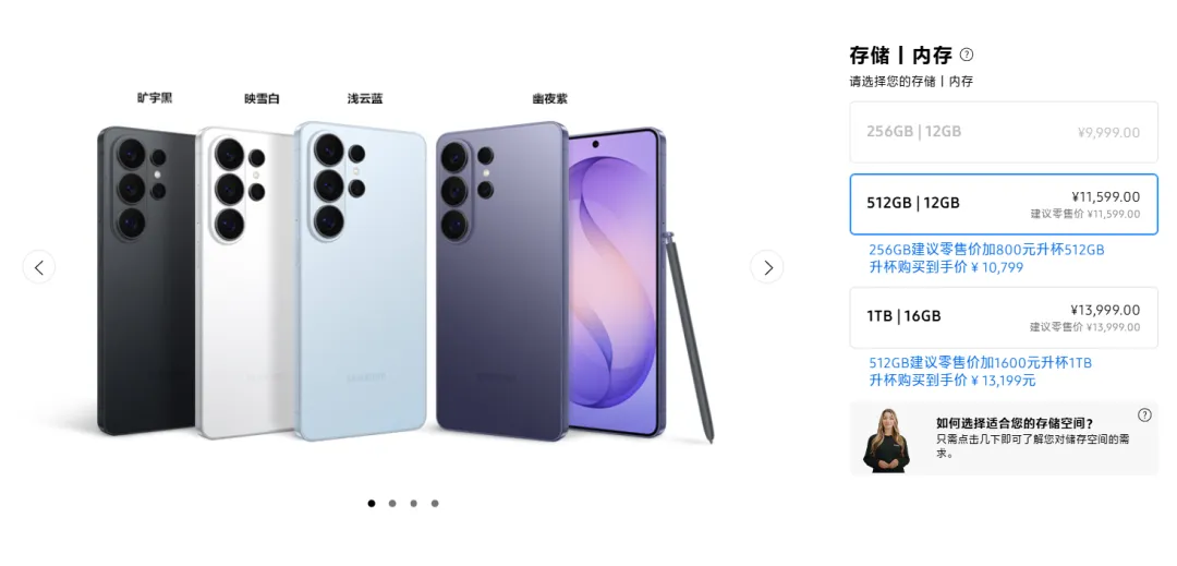 至于价格,12+256GB售价9999元,12+512GB售价11599元,16GB+1TB售价13999元。