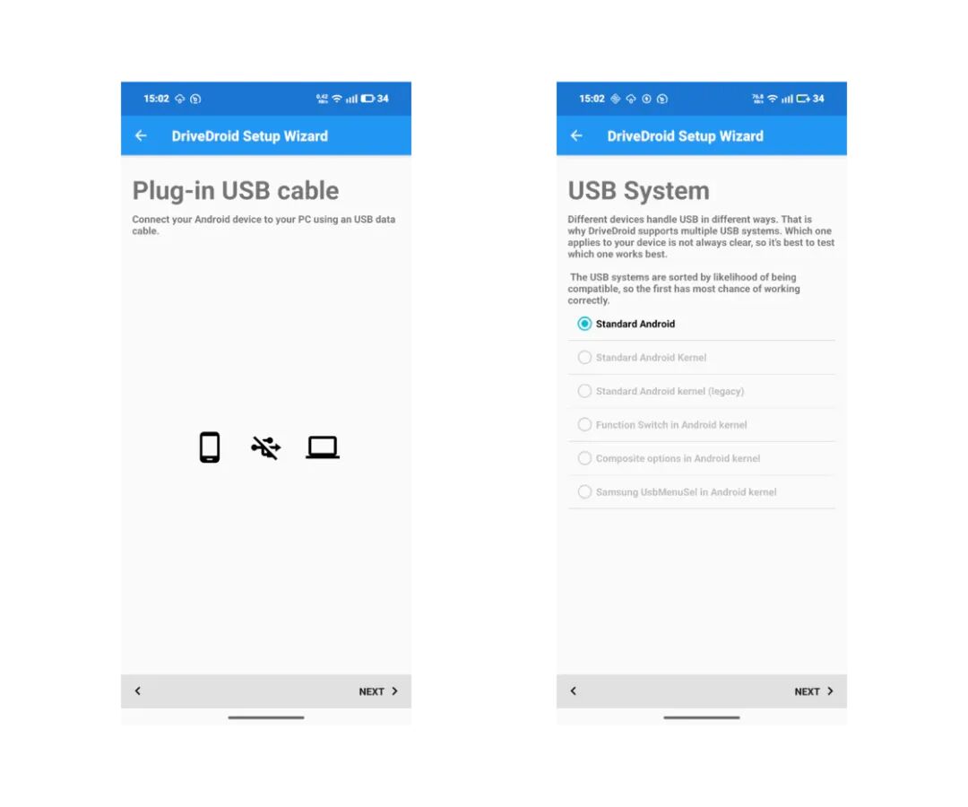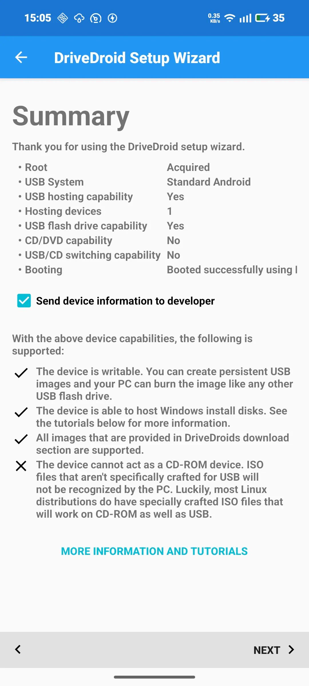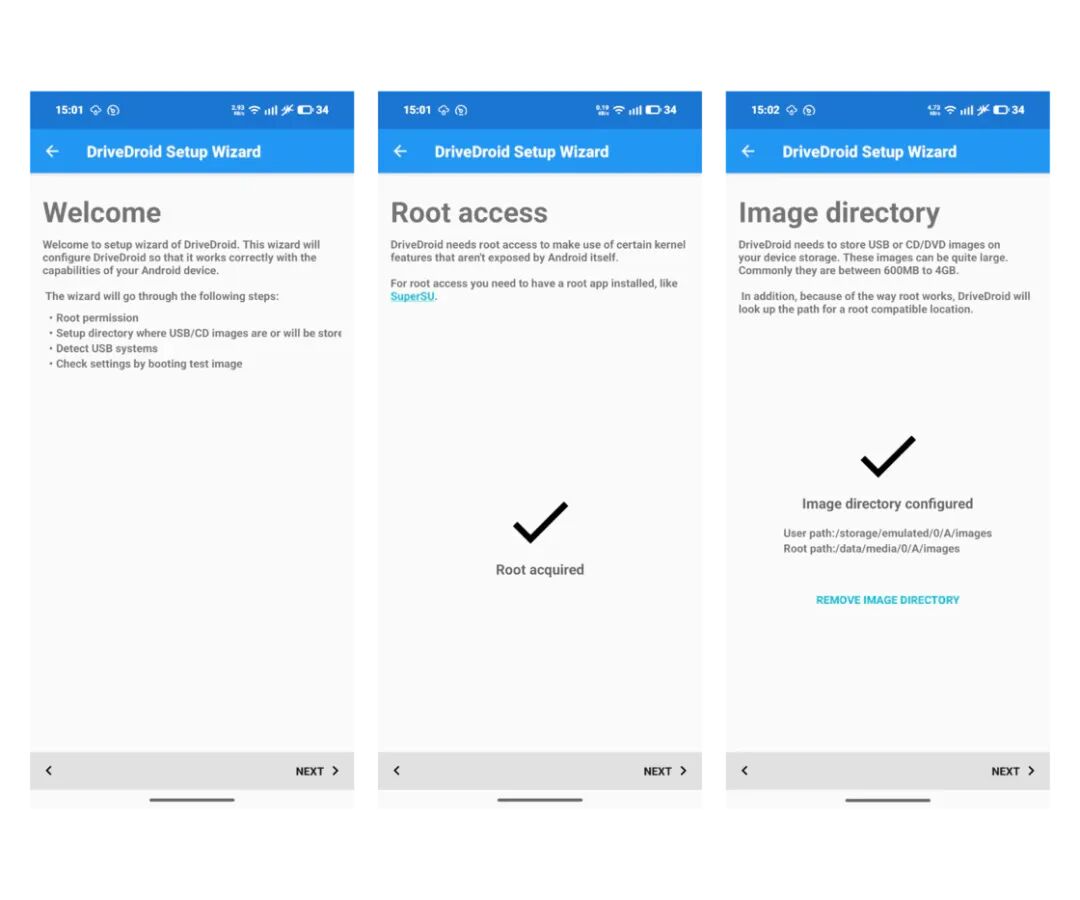 DriveDroid 需要 ROOT 权限才能正常工作,并且因为不同型号和系统的设备对于 USB 传输的处理方式不同,所以在第一次打开 DriveDroid 时需要运行一个设置向导来检测 APP 是否能正常工作。