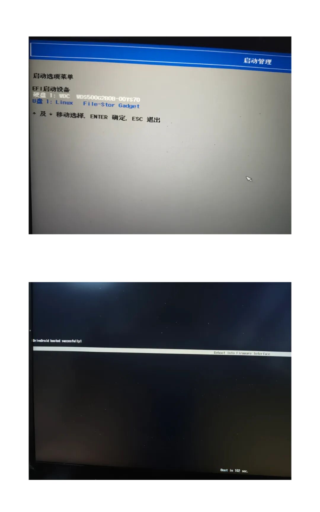 之后不要断开数据线连接,重启电脑进入 BIOS,会发现有一个新的启动项可用,确认关闭了安全启动,并选择这个启动项启动电脑,如果电脑能够成功启动并显示「DriveDroid booted succesfully」,就说明一切配置完成了。