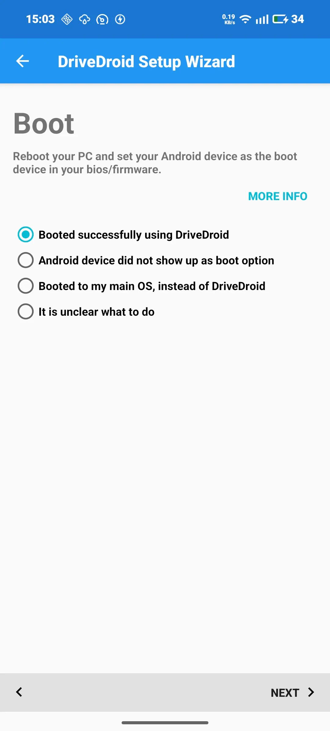 再次点击 NEXT 后 DriveDroid 会尝试启动,此时需要在电脑上检查是否出现了一个新的 USB 设备或是 CD-ROM 设备,如果出现了,就说明 DriveDroid 能够正常工作,在 Windows 上,USB 设备可能不会在文件管理器中出现,但是系统会有新设备插入的提示音,这种应该也算是正常工作。如果正常工作就选择「Android shows up in OS」并点击 NEXT,如果没有新设备出现,就回到上一个页面尝试不同的 USB System,如果都不行,那就可能是设备不兼容,可以尝试安装前文提到的 Magisk 模块。