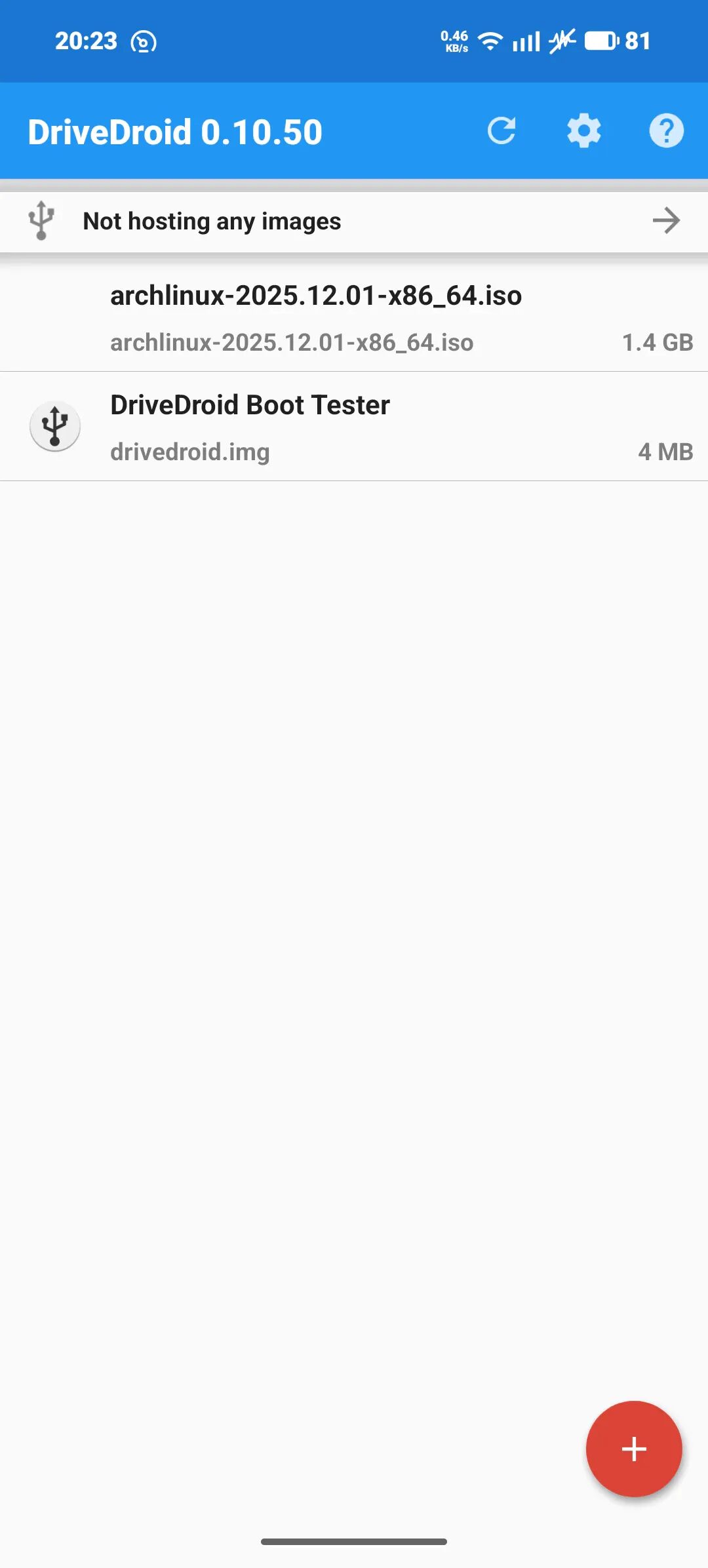以 Arch Linux 为例,我可以从国内镜像站下载最新版本的 ISO 文件,将文件放入之前配置好的用来存储系统镜像的文件夹。在 DriveDroid 主界面下拉刷新,会发现除了之前运行设置向导时创建的测试镜像,也出现了刚刚下载的 Arch Linux 镜像。