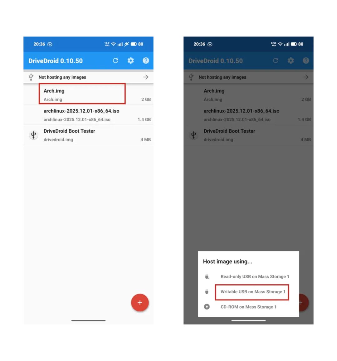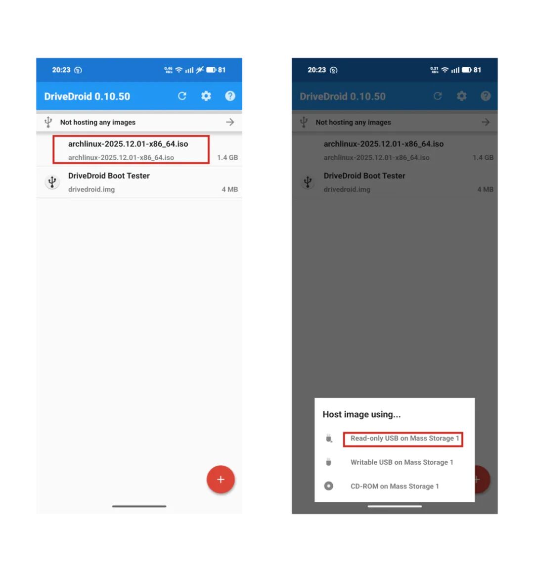 点击 Arch Linux 镜像,会弹出三个选项,分别是只读 USB、可读写的 USB 以及 CD-ROM,因为我的设备不支持模拟 CD-ROM,且系统镜像不需要读写,所以我选择只读 USB,当 Arch Linux 镜像旁边出现了一个带锁的 USB 图标,就说明 DriveDroid 正在把 Arch Linux 模拟为只读 USB 启动盘。
