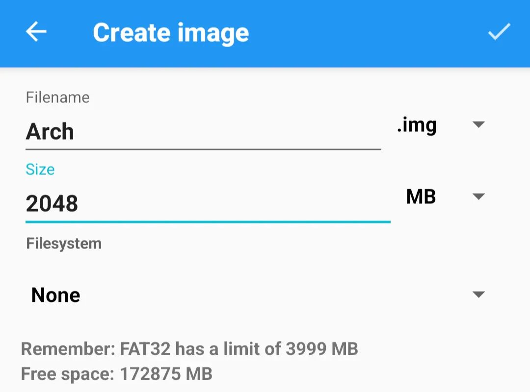 为镜像文件命名,因为只有付费版 DriveDroid 才能重新调整 img 文件大小,所以这里的文件大小需要一步到位,要不小于镜像文件的大小,但也不要太大占用多余的存储空间,因为 Arch Linux ISO 文件大小约为 1.4G,为了保险,我将空白文件大小设为了 2G,文件系统选择 None 不指定,因为后面写盘软件会对其格式化,配置完毕点击右上角完成。
