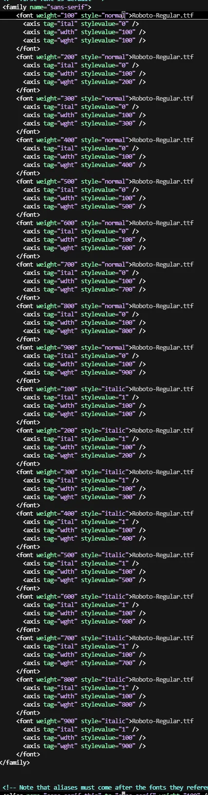 在安卓中,系统使用fonts.xml进行字体配置(新版本安卓16使用font_fallback.xml进行字体配置)。可在网上自行搜索下fonts.xml文件。这里简单叙述下系统如何解析fonts.xml的。