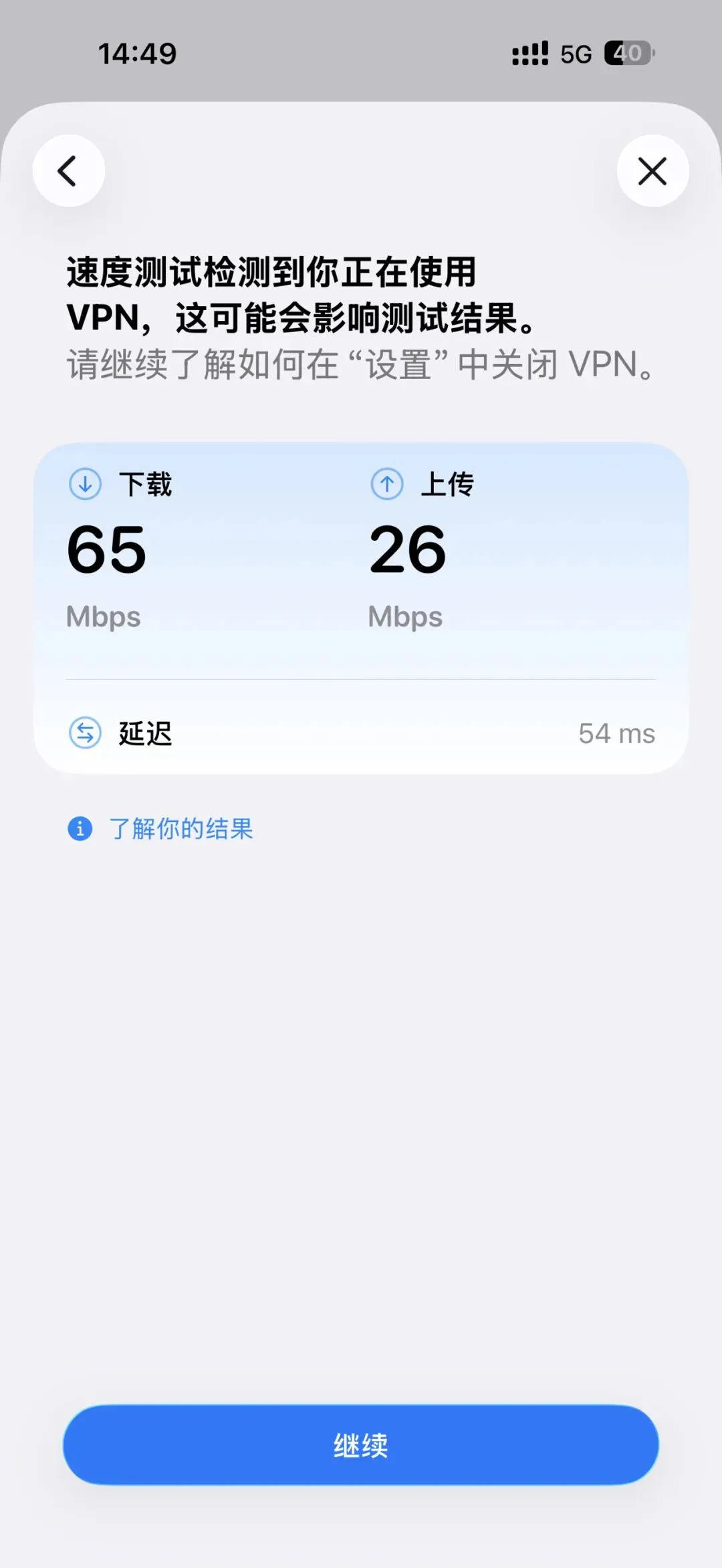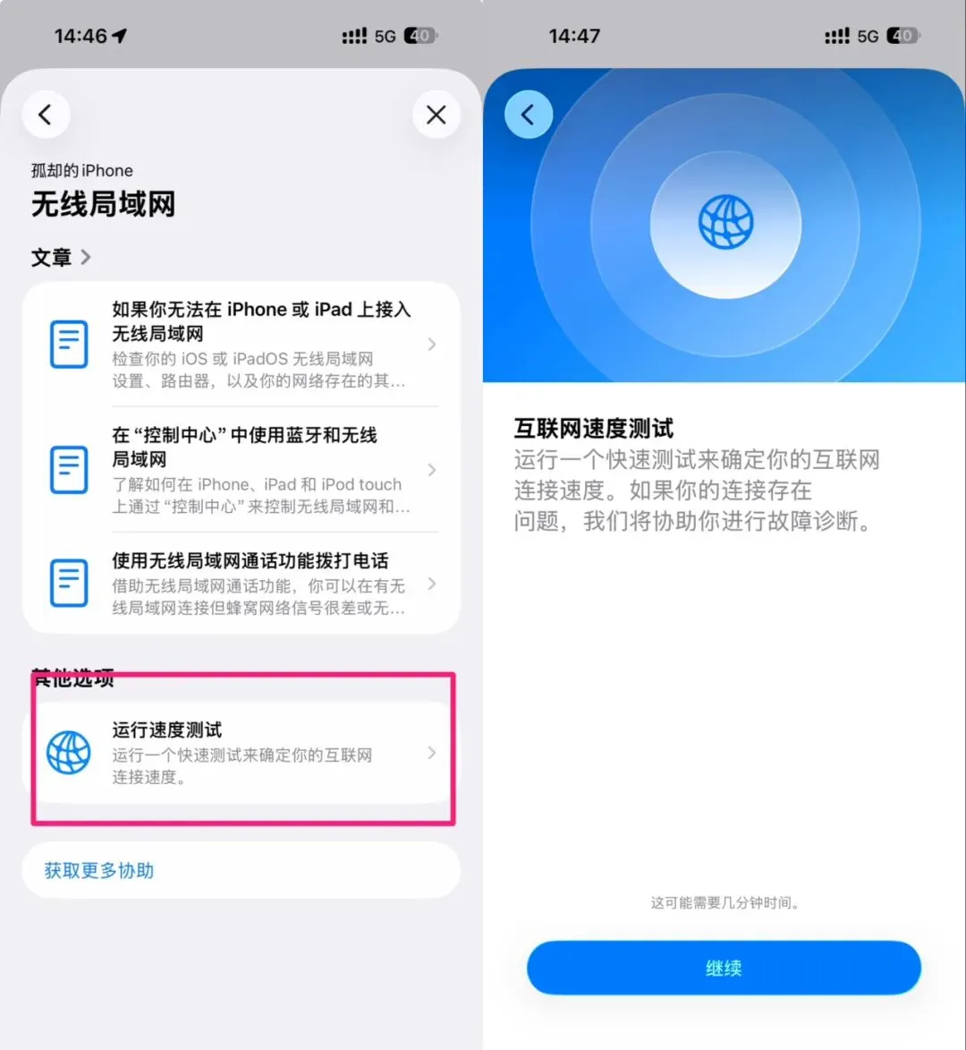 进入测速页面后点击「继续」,完成相关条款确认后,系统将自动连接苹果官方服务器,依次完成下载、上传速率测试。
