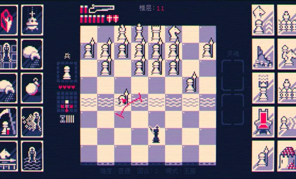 策略与射击:每一回合,你可以选择移动你的国王或射击敌人的棋子。之后,你需要再次移动来给霰弹枪装弹。避免被对方将死,同时寻找机会杀死敌方的王,完成每一层的关卡挑战。