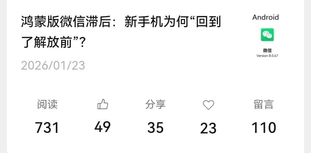 公众号的阅读来源有公众号主页、公众号消息、朋友圈、聊天会话、搜一搜、推荐、其他。大家平时关注的重点都在“推荐”这个来源上,而我一月份发的一篇文鸿蒙版微信滞后:新手机为何“回到了解放前”?,看它公众号后台的数据显示,“推荐”阅读占比一直为0%,但却在30天内收获了700以上的阅读次数,700多的阅读量肯定不是爆款,可是在完全没有平台推荐的情况下,还走到了这个成绩,我觉得也算是一次不小的收获。