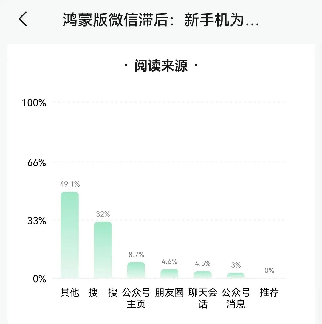 - “搜一搜”(32%):近三分之一的读者是通过主动搜索进入文章阅读的,应该是触碰到了关键词产生的效果。这也说明了文章选题的强需求属性,鸿蒙版微信的适配问题是用户关心的热点,具有天然的搜索流量潜力。只要有人搜索了跟这个文贴边的关键词,就有可能推荐给读者阅读。搜的人多了,或者阅读的人多了,是不是也就有可能往爆款的文章发展了呢。