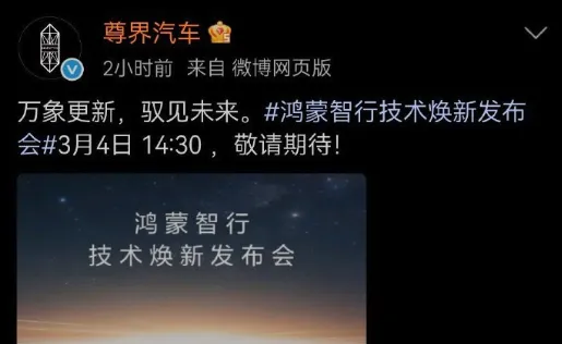 鸿蒙智行技术焕新发布会将于3月4日举行,事关这2界,或发布问界M6相关信息!