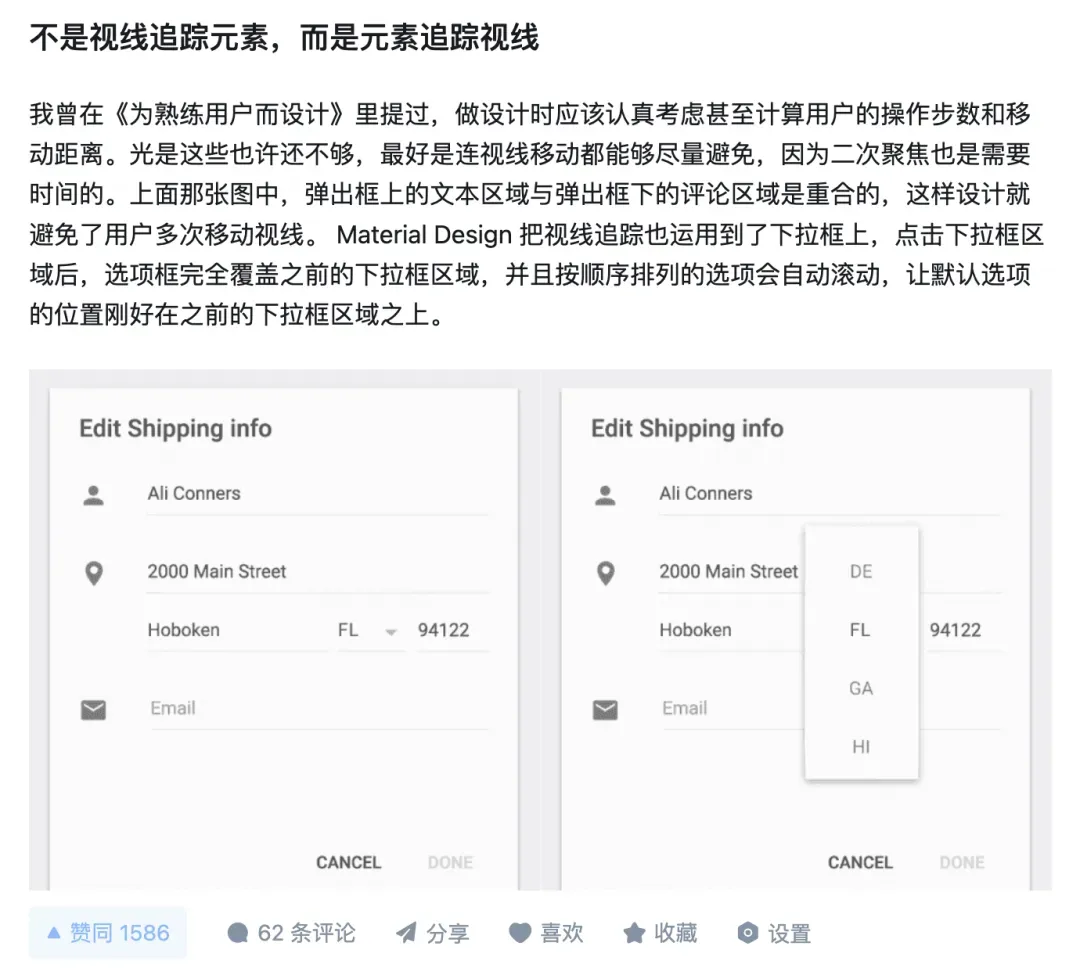 上次我发了一篇文章,说iOS26虽然液态玻璃很有争议,但交互上做了很多令人惊喜的创新。例如下图这种弹窗,以往都是居中弹出的,现在改成了从按钮上弹出。我当时的观点是,这种弹窗可以让用户的视线和手指都保持原位,不需要大幅动作即可完成操作,更加高效。我曾经在知乎分享过 Material Design 的千赞文。他们是把菜单,叠在了下拉框上面,设计思路有异曲同工之处:
