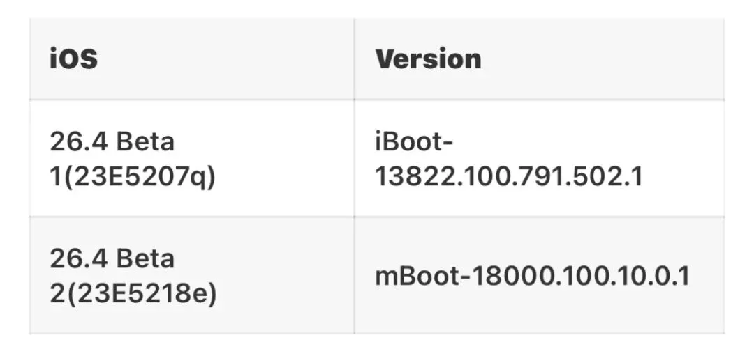 在 iOS 26.4 Beta 2 更新中,苹果调整沿用近二十年的系统启动器(Bootloader),由“iBoot”悄然更名为“mBoot”,其版本号也从 13822 暴涨至 18000 开头。